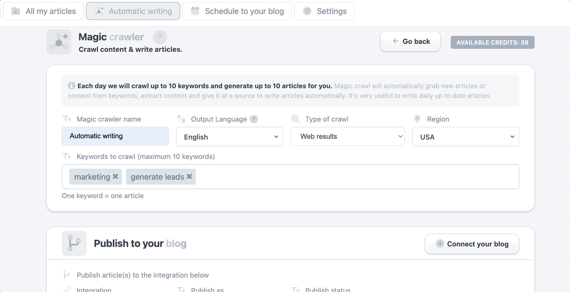 Write SEO articles and news to increase your SEO. You will be able to write articles and news with AI to increase your SEO. The software is perfect for SEOs, marketers, and content creators. The best SEO articles & news writer.